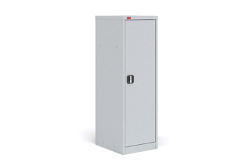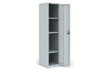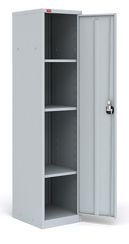 Шкаф разборный односекционный металлический. Имеет три регулируемые по высоте полки, дверь шкафа оборудована замком повышенной секретности и ригельной системой запирания.