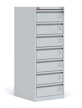 Металлическая картотека, семисекционная, с центральным замком. Используется для хранения документации в формате А5. Имеет антиопрокидывающее устройство и телескопические направляющие.