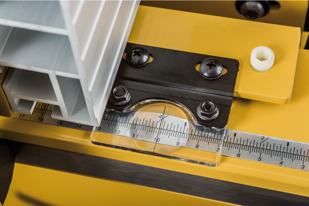 В комплекте со станком идёт несколько упоров для подачи заготовок. Во-первых, параллельный. Он выполнен в виде алюминиевого профиля, устанавливаемого на жёсткий стальной кронштейн, который перемещается по направляющей. Фиксацию производят движением рычага. Есть разметка и лупа для считывания миллиметровых делений. Во-вторых, это цилиндрический упор для пиления с фиксированным отступом от края криволинейной заготовки. Он крепится на алюминиевый профиль. В-третьих, угловой поворотный упор с транспортирной шкалой, скользящий по столу вдоль Т-образного паза.
