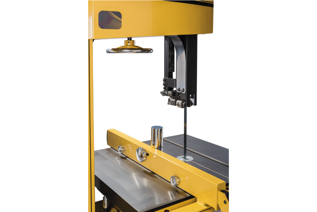 С технической точки зрения конструкция станка представляет собой сочетание основательности и внимания к деталям. О первой красноречиво говорит вес – почти 400 кг. Все ответственные узлы изготовлены с большим запасом прочности, что позволяет работать с крупными заготовками, не опасаясь поломок, обеспечивает высокую жёсткость и, как следствие, отсутствие вибраций. О втором – удобство, с которым производятся все настройки и регулировки. К примеру, наклонный механизм стола имеет кроме фиксатора и транспортирной шкалы зубчатый привод от маховика. Все вращающиеся рукоятки с полированным ободом, что и красиво, и эргономично; запоры на дверях быстрозажимные по подобию замков. Есть все привычные профессионалам системы: реечная регулировка верхних направляющих, натяжитель ленты со стрелочным индикатором усилия, рычаг для быстрого ослабления полотна и даже педаль остановки с механическим тормозом выбега шкивов (альтернатива выключателю на панели). Станок может работать как с широкими лентами (до 40 мм), так и с самыми узкими 3-миллиметровыми, что позволяет качественно выполнять и прямые, и криволинейные резы. Трёхточечные направляющие роликовые, с удобным и точным механизмом настройки.