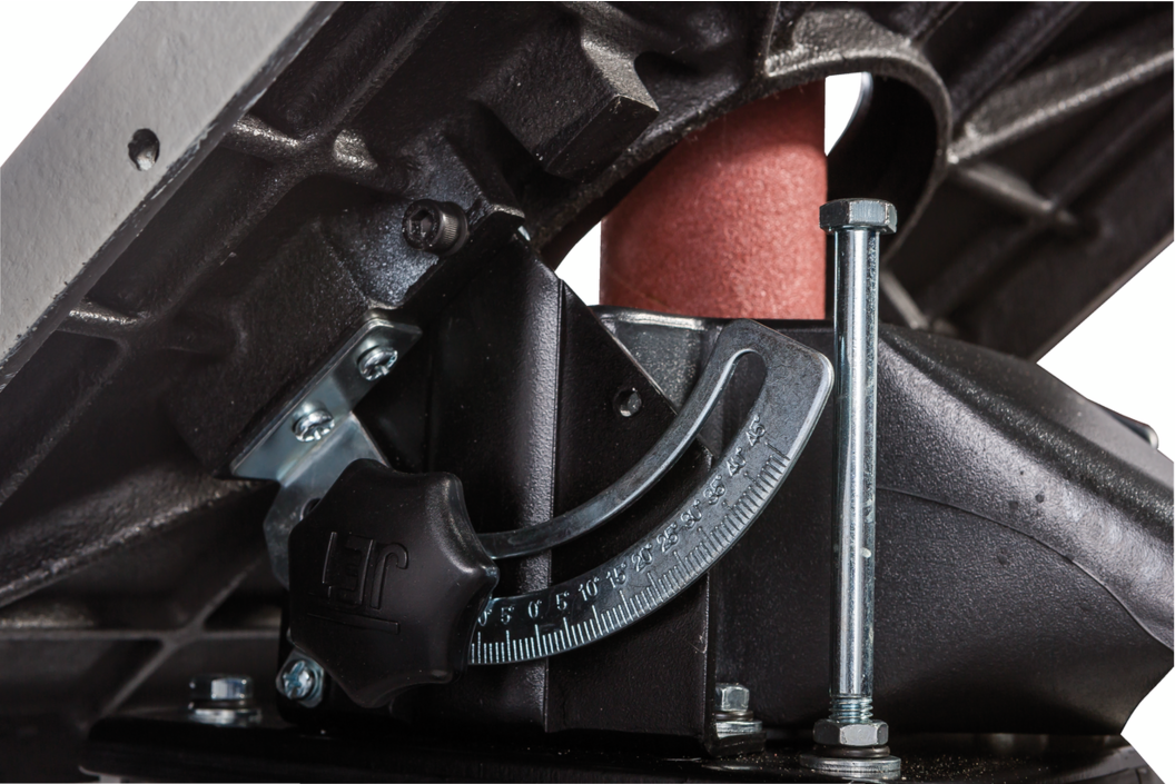 Мощный асинхронный двигатель рассчитан на продолжительную эксплуатацию, массивный корпус на резиновых опорах и тяжёлый чугунный стол хорошо поглощают вибрации. Есть механизм наклона стола на угол до 45°, чтобы шлифовать под углом.