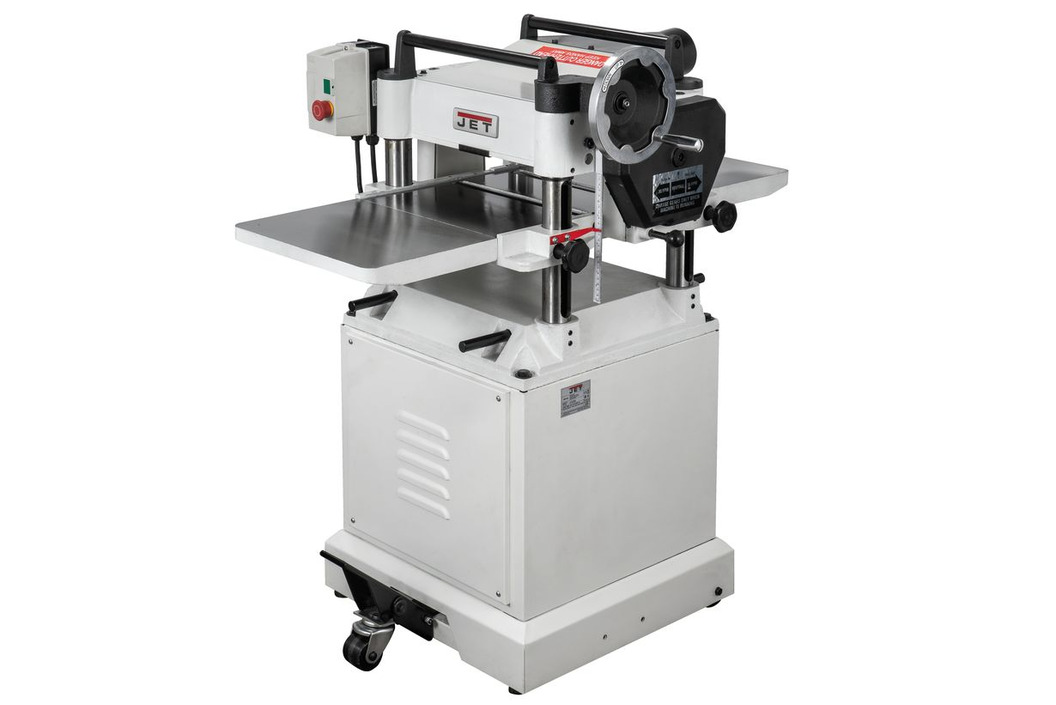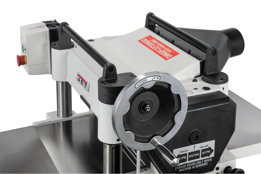 JWP-15K — рейсмусовый станок с прочной и массивной конструкцией, предназначенный для профессиональной и любительской эксплуатации. Рабочий стол, его удлинения, основание и строгальный узел сделаны из чугуна. Регулировка просвета происходит при подъеме и опускании стола, в нижнем положении расстояние до ножей превышает 200 мм, что позволяет пропускать крупные брусья или доски, поставленные на ребро.