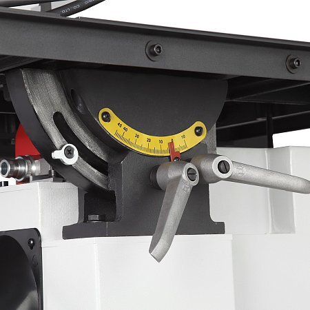 Скорость пильного полотна одна – 1080 м/мин.Рабочий стол из литого чугуна размером 630×480 мм и стальное расширение 150×480 мм создают просторную и виброустойчивую поверхность для работы с крупными деталями. Угол наклона стола плавно регулируется от 0° до +45°.