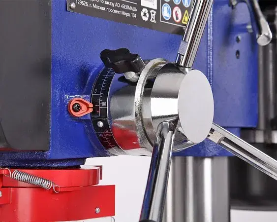 В комплекте предусмотрены тиски. Для их крепления есть четыре паза на рабочем столе и два на основании. Шкала, расположенная на рукоятке регулировки глубины сверления, показывает ход пиноли шпинделя, с ее помощью можно настраивать ход пиноли, для этого необходимо провернуть шкалу, стрелка на корпусе будет показывать значение, на которое будет возможно погружение сверла, затем затянуть барашек. Наконечники тройной рукояти удобной формы, что способствует плавной подаче сверла к заготовке. Для точного позиционирования станок оснащен лазером - указателем.