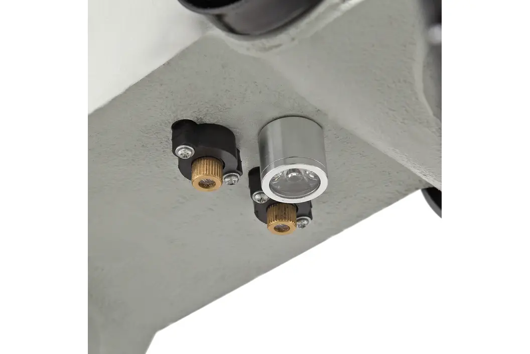 Элементы управления станком выведены на переднюю часть сверлильной головки. Это кнопки включения и выключения, кнопка аварийной остановки. Для точного позиционирования в конструкции этой модели предусмотрены лазерный указатель и подсветка.