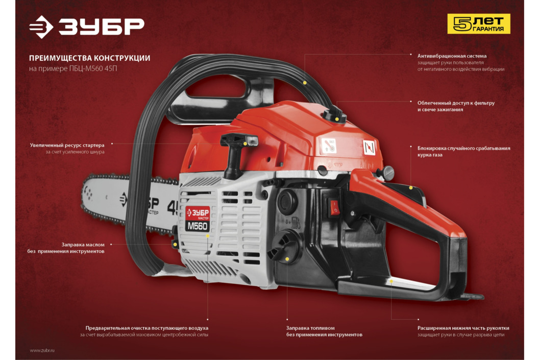 На электроинструменты и бензотехнику «ЗУБР» действует расширенная 5-летняя гарантия. Служба качества контролирует процесс производства на каждом этапе.