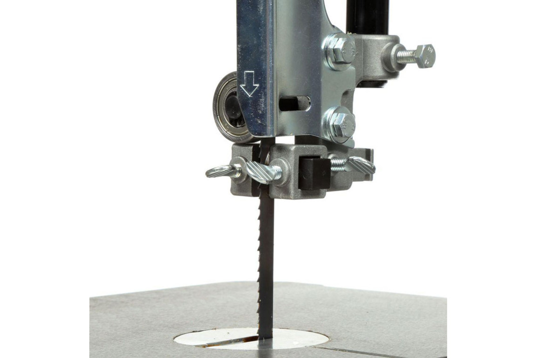 Особенность станка заключается в том, что его ключевые параметры можно варьировать, «подгоняя» под конкретные задачи, решаемые в мастерской. Во-первых, предусмотрено увеличение высоты пропила. Для этого предназначен комплект деталей со 150-миллиметровой вставкой в раму, после её монтажа доступна распиловка заготовок высотой до 305 мм (естественно, требуются более длинные, чем изначально, полотна). Во-вторых, доступны разные варианты трёхточечных направляющих полотна. Штатный — регулируемые скользящие со сменными пластиковыми вставками-слайдерами — оптимален для точных резов с небольшой нагрузкой. Дополнительный — трёхроликовые с шарикоподшипниками — максимально универсален и обеспечивает наименьший износ полотна при тяжёлых работах.