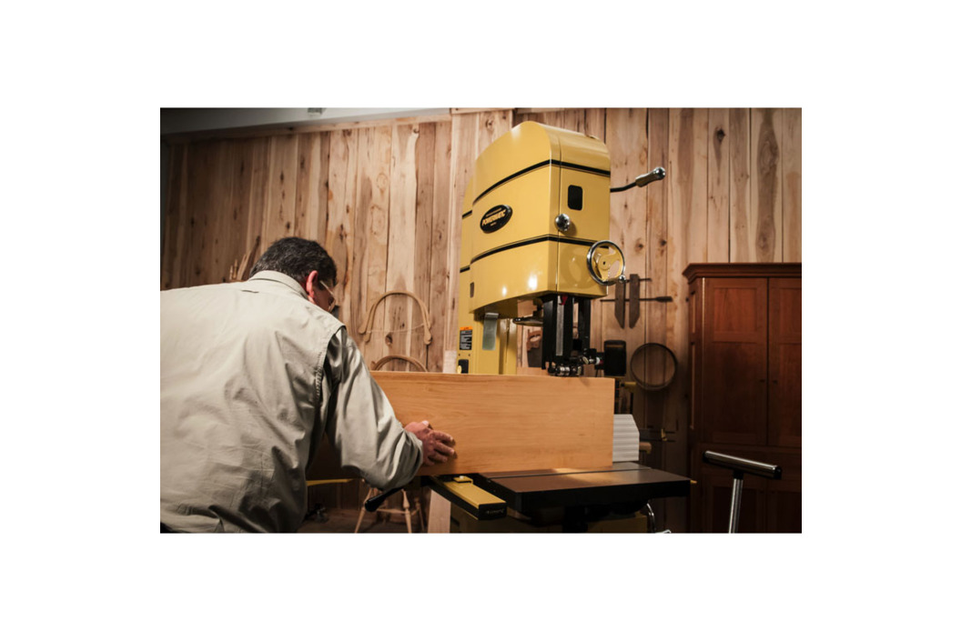 С технической точки зрения конструкция станка представляет собой сочетание основательности и внимания к деталям. О первой красноречиво говорит вес – почти 400 кг. Все ответственные узлы изготовлены с большим запасом прочности, что позволяет работать с крупными заготовками, не опасаясь поломок, обеспечивает высокую жёсткость и, как следствие, отсутствие вибраций. О втором – удобство, с которым производятся все настройки и регулировки. К примеру, наклонный механизм стола имеет кроме фиксатора и транспортирной шкалы зубчатый привод от маховика. Все вращающиеся рукоятки с полированным ободом, что и красиво, и эргономично; запоры на дверях быстрозажимные по подобию замков. Есть все привычные профессионалам системы: реечная регулировка верхних направляющих, натяжитель ленты со стрелочным индикатором усилия, рычаг для быстрого ослабления полотна и даже педаль остановки с механическим тормозом выбега шкивов (альтернатива выключателю на панели). Станок может работать как с широкими лентами (до 40 мм), так и с самыми узкими 3-миллиметровыми, что позволяет качественно выполнять и прямые, и криволинейные резы. Трёхточечные направляющие роликовые, с удобным и точным механизмом настройки.