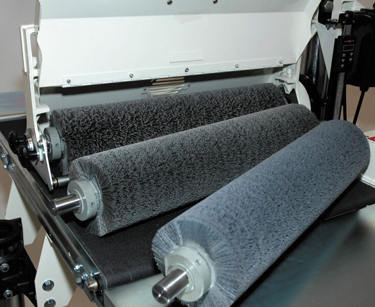 Рабочий инструмент станка – щеточный вал диаметром 127 мм и длиной 515 мм – расположен консольно, что позволяет шлифовать заготовки шириной до метра. Подача осуществляется транспортерной лентой, скорость бесступенчато регулируется в диапазоне от 0 до 3 м/мин. Потребляемая мощность основного двигателя – 3,5 кВт. Консоль с валом перемещается вверх-вниз при помощи штурвала, что позволяет настраивать станок под детали высотой от 2 до 100 мм; контроль производят по цифровому ЖК-индикатору. Входящий в комплект поставки полимерно-абразивный вал с зерном 80G, можно заменить на полимерно-абразивные валы с зерном 120G и 240G или на металлическую щетку с толщиной проволоки 0,5 мм – они продаются отдельно.ОСОБЕННОСТИ: