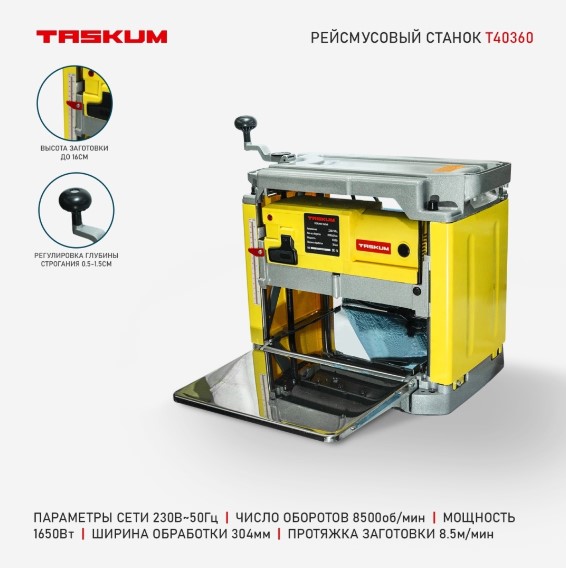 Характеристика Значение Напряжение, В 230 Частота, Гц 50 Число оборотов, об/мин 8500 Мощность, Вт 1650 Ширина обработки, мм 304 Протяжка заготовки, м/мин 8.5 Высота заготовки до 16 см Регулировка глубины строгания, см 0.5-1.5 -