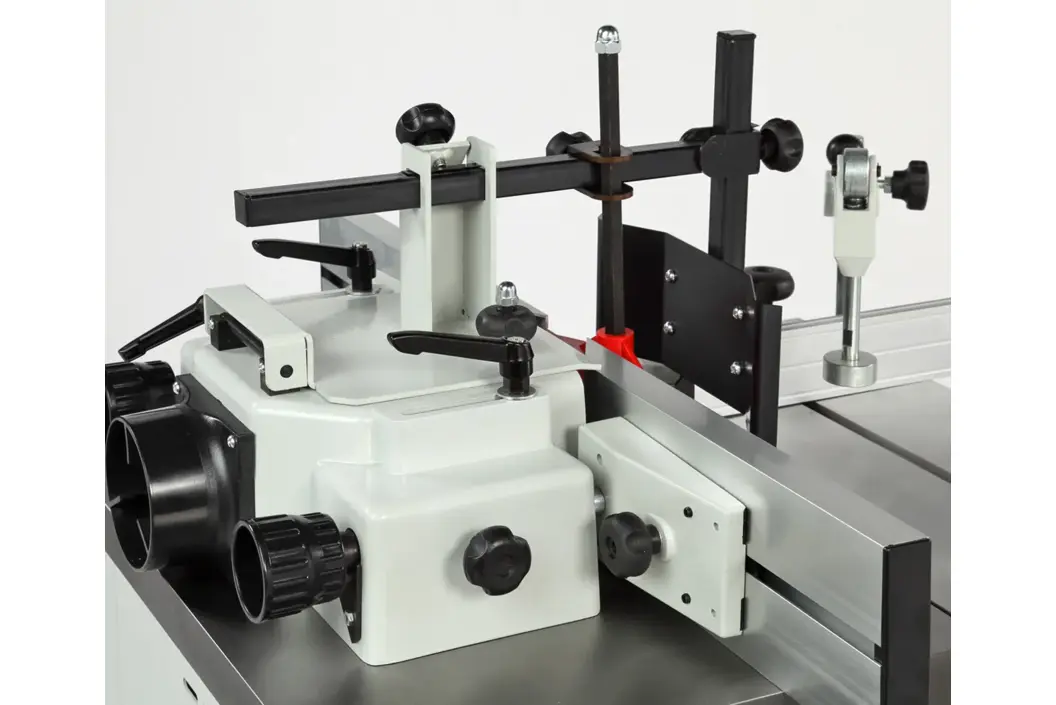 Станок оснащен чугунным рабочим столом и кареткой с подвижным столом. Подвижный стол выполнен из алюминия, в нем имеется стандартный паз под установку углового упора с эксцентриковым зажимом для фиксации заготовок. Корпус изделия закрытый, изготовлен из листовой стали. В комплект поставки входит шпиндель 30 мм и зажимной патрон с тремя цангами (8, 12 и 12,7 мм) и наборные кольца разной высоты. Принадлежности для шлифования и фрезерования являются дополнительными аксессуарами в комплект поставки не входят.