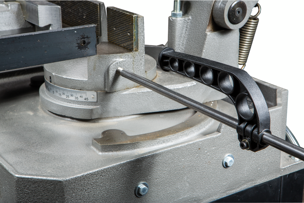 Станок оборудован удобной ручкой управления, позволяющей оператору эффективно руководить производственным процессом. Станок MCS-315 имеет быстрозажимные тиски, позволяющие осуществлять серийную обработку заготовок одного типа. Качество обработки, высокая производительность работ обеспечивается наличием упора, с помощью которого регулируется длина заготовок при серийных работах.