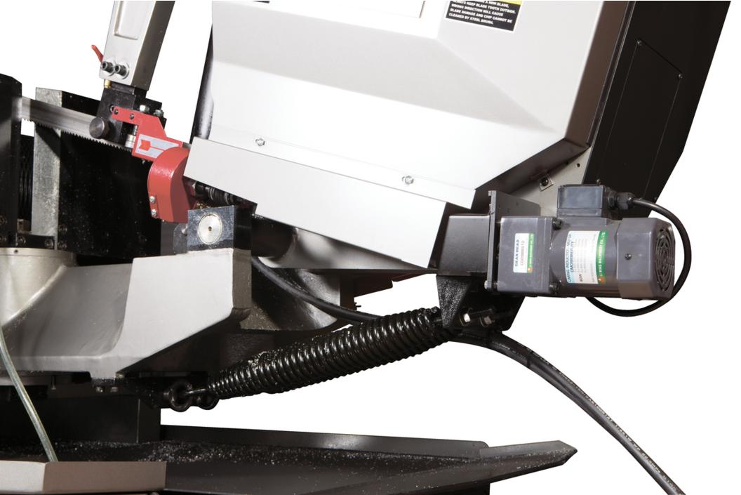 Ленточнопильный станок имеет две направляющие, регулирующие проход полотна, предотвращающие увод полотна при пилении заготовок большого диаметра. Направляющие имеют подшипники, создающие необходимое позиционирование полотна под прямым углом. Очистка полотна от стружки осуществляется с помощью вращающейся корд щетки. Станок оборудован системой подачи СОЖ на направляющие и непосредственно в зону резания.