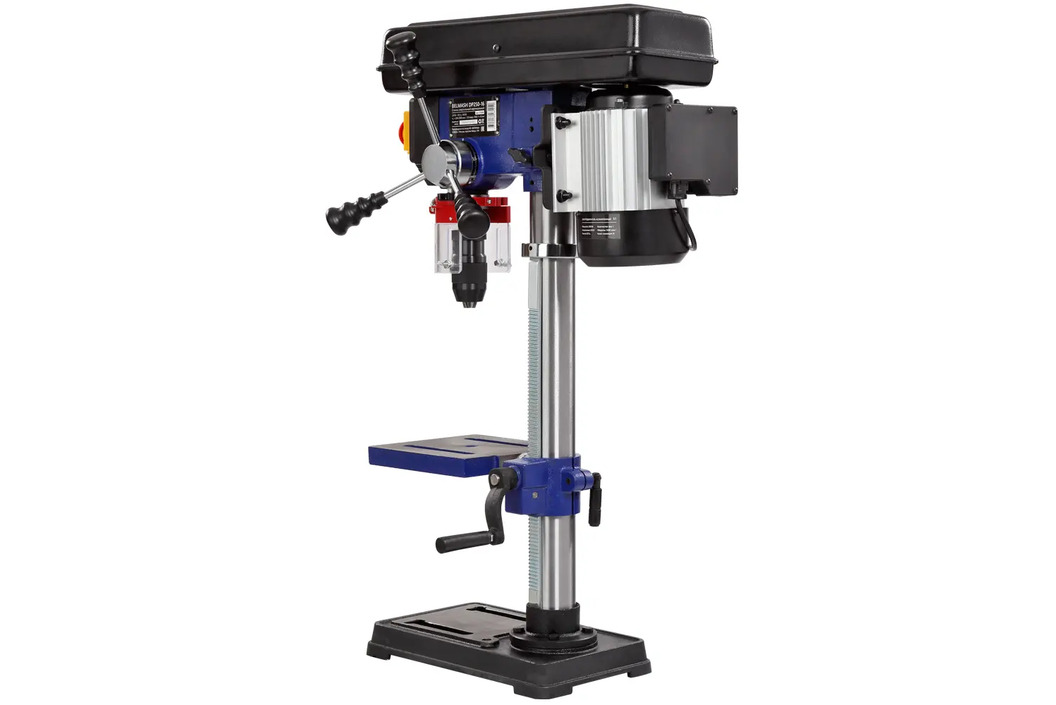 Модель DP250-16 простая, но обладает целым рядом достоинств. Стол, опора и корпус сверлильной головки выполнены из чугуна, что придает оборудованию серьезный вес - 30 килограмм. Двигатель асинхронный, мощностью 500 Вт. Станок высокий – 855 мм, подходит для обработки заготовок большой толщины. Максимальное расстояние между шпинделем и столом – 430 мм.