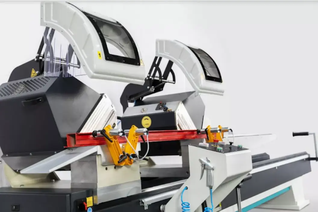 Автоматическая двухголовая фронтальная пила с системой подачи смазочно-охлаждающей жидкости Yilmaz DC 421 PSD?предназначенна для прямой резки или резки под углом ПВХ или алюминиевых профилей больших размеров пильными дисками Ø 420 мм.